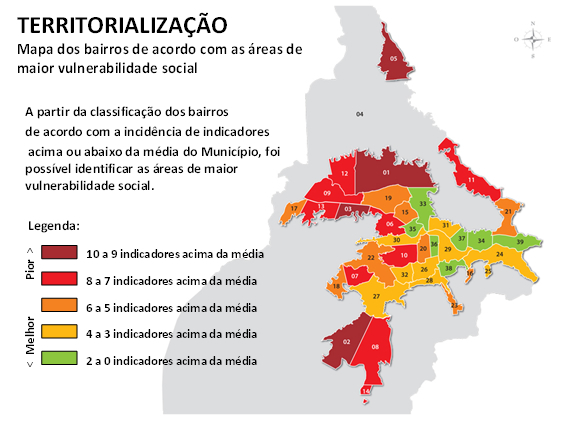 A fim de identificar as áreas com maior vulnerabilidade do Município, foram estudados onze indicadores da população residente de cada um dos 38 bairros e área rural, referentes ao perfil socioeconômico, escolaridade, educação básica, densidade domiciliar e demandas de atendimento em serviços e programas da assistência social.